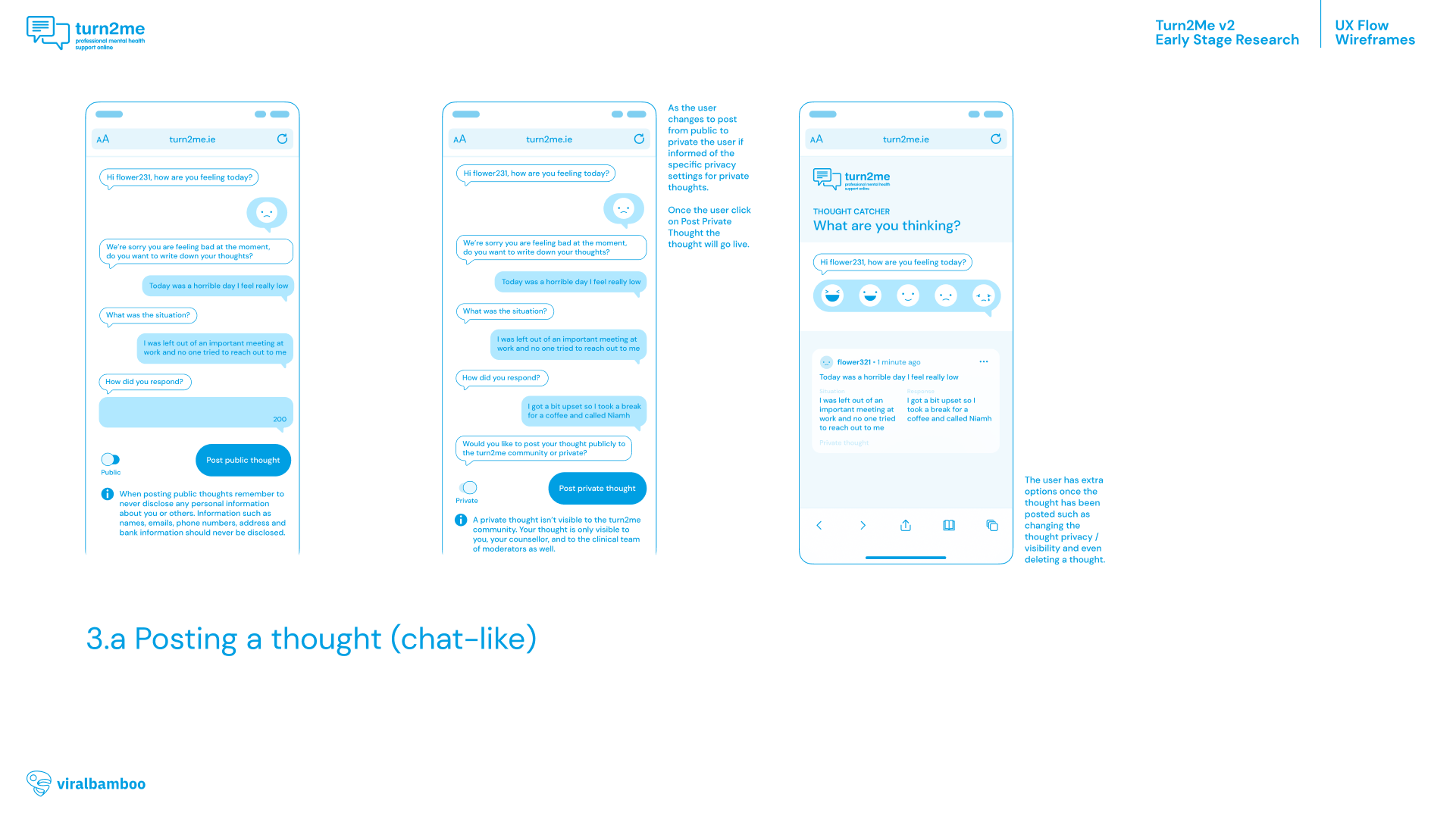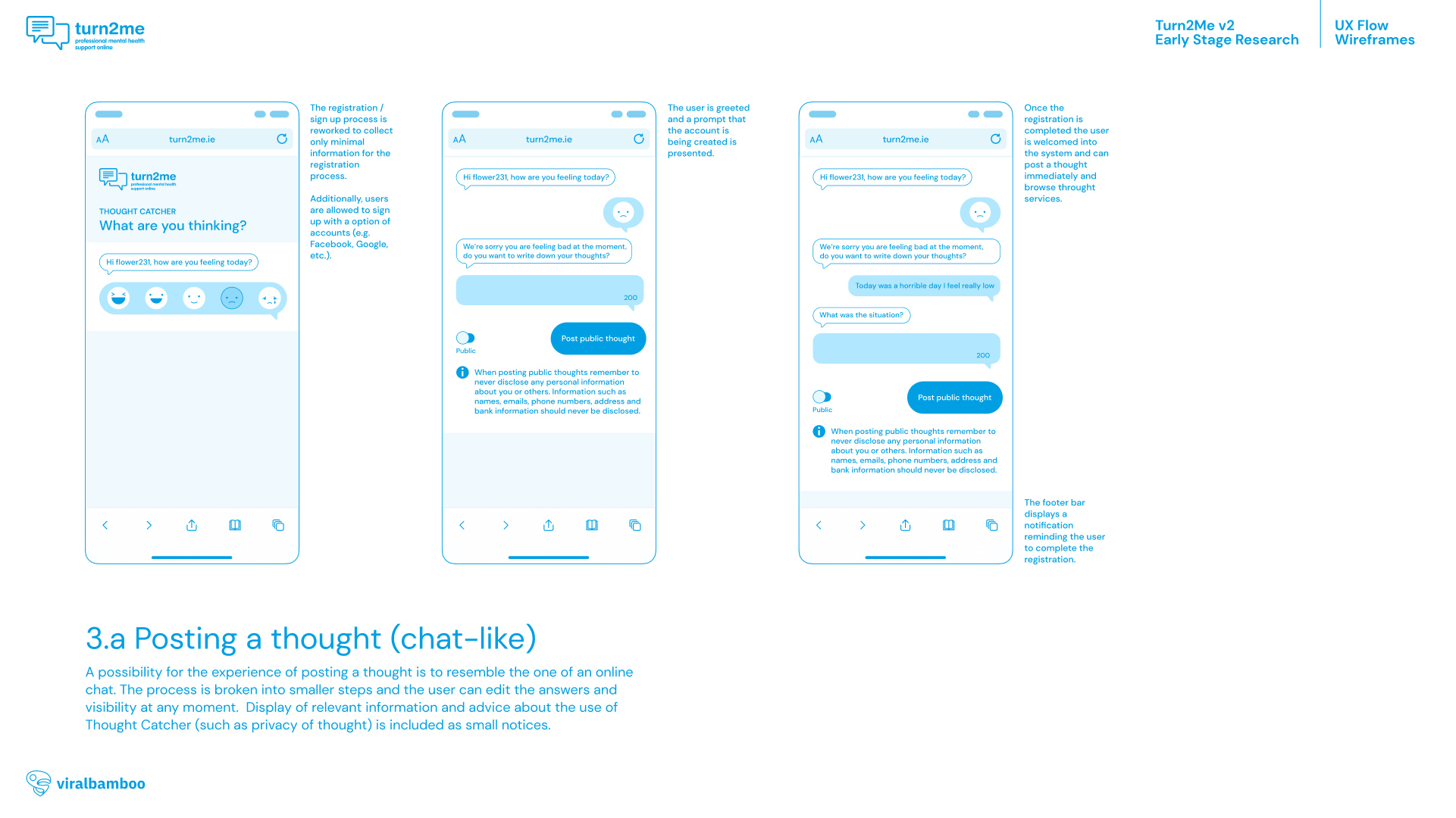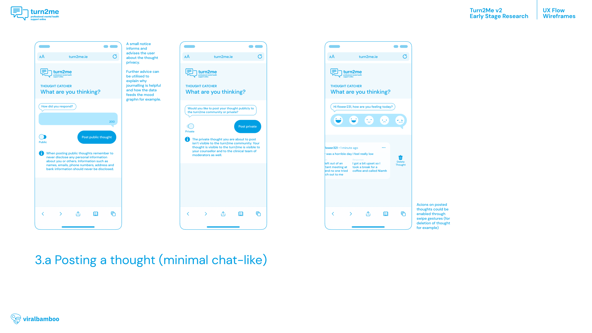 Turn2Me is an Irish mental health charity that delivers professional counselling services online. The Turn2Me app is a web-based application in which users can apply for free counselling, join support groups, and also benefit from day-to-day peer support in a moderated feed of public thoughts. Through its innovative “Thought Catcher” feature users are able to seek and provide one another support by commenting, reacting, and flagging unsafe content for review.