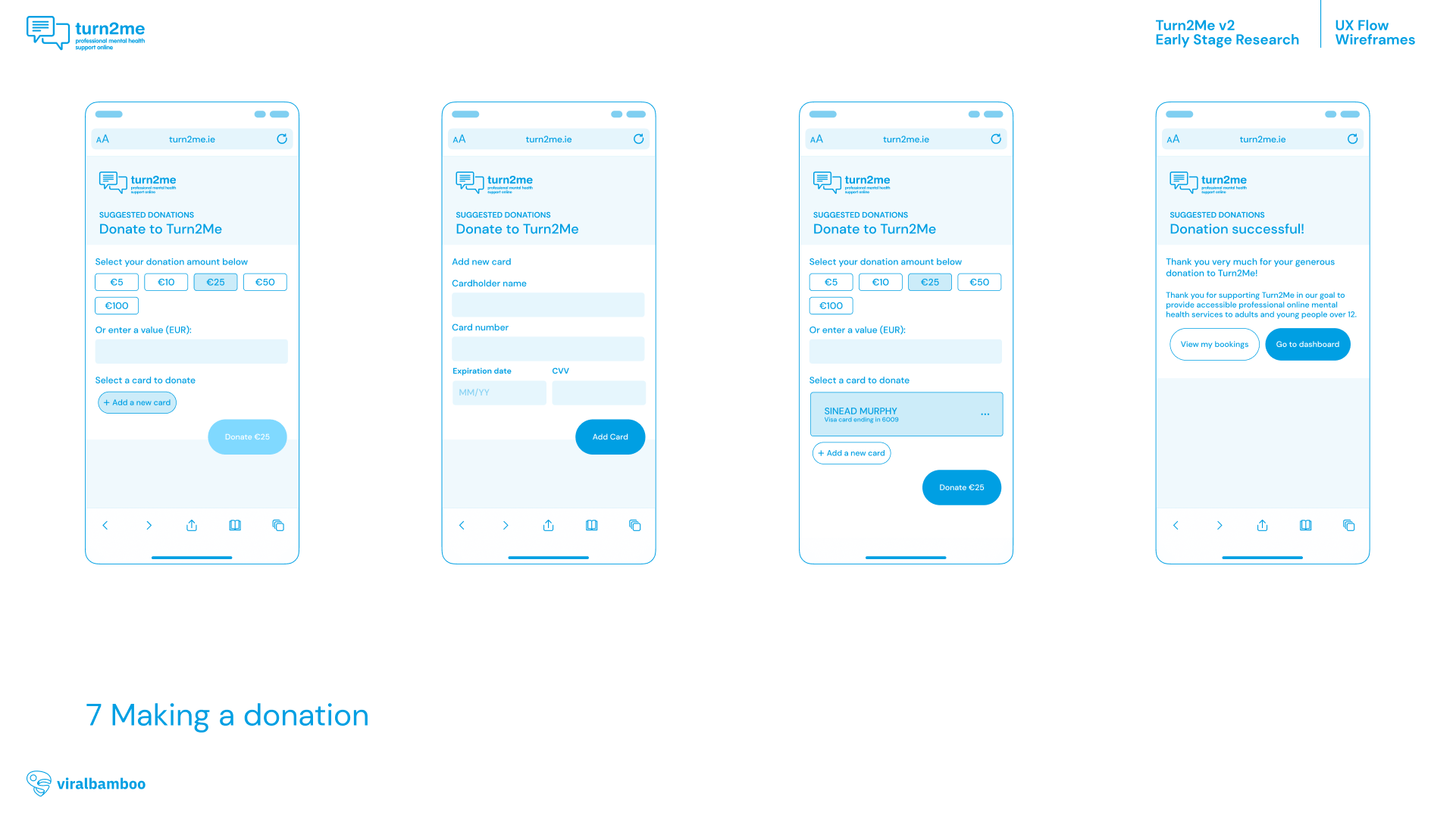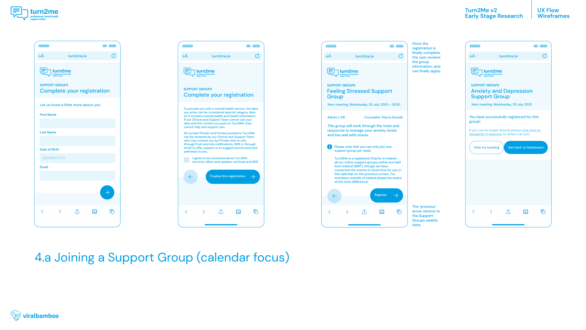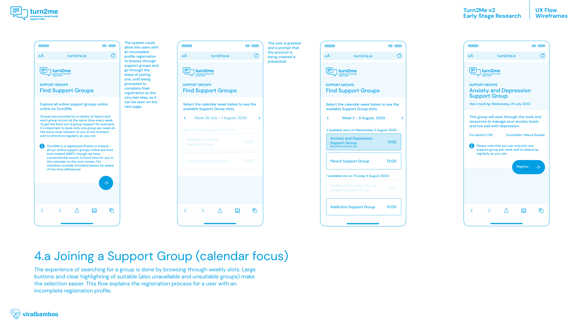 By focusing on pain-points from the project personas and growing numbers of counselling and support groups slots, I created wireframes flows and low-fidelity prototypes of the application. Moments such as the user registration and onboarding, the process of posting thoughts, joining support groups, applying for free counselling, and completing a donation in the system were modelled with a mobile-first delivery in mind.